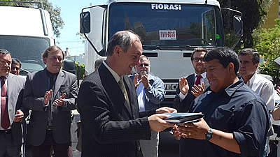 En el acto encabezado por el ministro de Gobierno, Javier Touriñán, y el subsecretario de Asuntos Municipales, Néstor Hourcade, en el paseo Peatonal Fontana de Rawson, fueron entregados tres minibuses, una camioneta, un furgón y un camión.