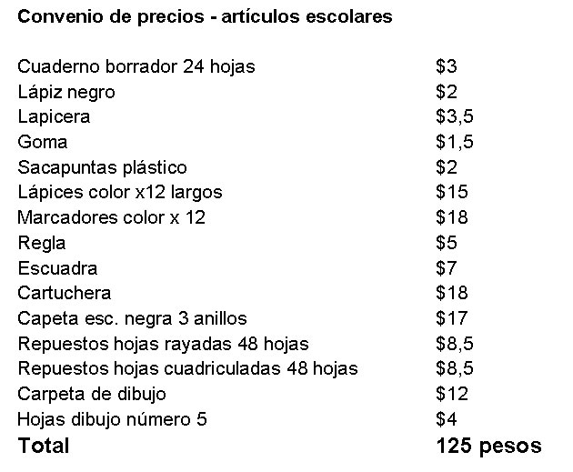 Este convenio de precios incluye los siguientes artículos escolares: Cuaderno borrador 24 hojas: $3; Lápiz negro: $2; Lapicera: $3,5; Goma: $1,5; Sacapuntas plástico: $2;