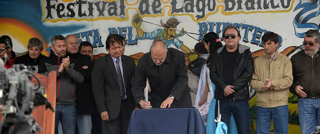 La apertura de la 8° Fiesta Regional del Puestero, se desarrolló en el Predio Pablo Daniel Mansilla, donde el Gobernador firmó convenios y entregó distintos aportes, junto al jefe comunal Guillermo Ordoñez, quien valoró que las obras se realizan «con mano de obra netamente local», y destacó que «son trabajos para el futuro de Lago Blanco. Hoy por hoy Lago Blanco es progreso, y están llegando obras necesitadas desde hace mucho tiempo», remarcó.