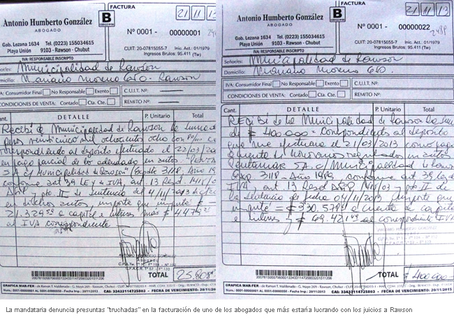 Ante la imposibilidad de defensa, detalló Artero, “la Municipalidad verificó que el Dr. González nunca había facturado los importantes montos percibidos por este juicio. A requerimiento de la Secretaría de Hacienda el letrado aportó facturas que al ser revisadas tienen algo muy llamativo. La factura 001 del talonario 001 es de fecha 21 de noviembre del año 2013, es decir que imprimió los talonarios y facturó hace tres meses. Esta documentación la aportaremos a la AFIP para su conocimiento y efectos.