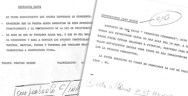 Bajo una sello que señala que el contenido es “estrictamente secreto y confidencial”, se informa que “se tiene conocimiento que (el comisario Patty sic)” había expresado lo siguiente: considera que la Fuerza Aérea argentina se está oponiendo sistemáticamente a la promulgación de la ley de pacificación. En caso de que su problema salga mal, o que no sea solucionado, ha conseguido y dará a conocer los aviones (matrículas), aeropuertos, destino, fechas y personal que trasladó delincuentes terroristas a disposición final”.