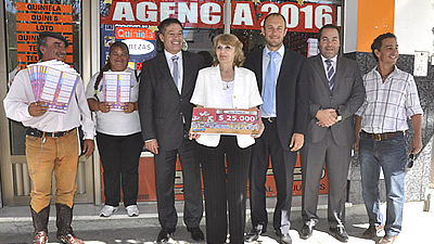 El presidente del Instituto de Asistencia Social (IAS) Lotería del Chubut, Marcelo Diz junto al gerente general Martín Sterner; el gerente de RRII del organismo Gabriel Jones y el delegado zonal Mariano Sánchez Cordi entregaron un premio de 25.000 pesos a Danilo Bisso, ganador del Bingo compartido de la Cuarta Ronda del sorteo del Telebingo del domingo 2 de marzo. El cartón ganador fue adquirido a un vendedor callejero de la agencia 2016 de Olga Cuenca.