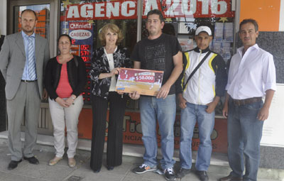 El gerente general del Instituto de Asistencia Social (IAS) Lotería del Chubut, Martín Sterner, el delegado zonal del organismo Mariano Sánchez Cordi y la titular de la agencia 2016, Olga Cuenca entregaron a la señora María Fernández y a su marido Pablo Parada de la ciudad de Rawson, 50.000 pesos en efectivo, correspondientes al premio Bingo de la Segunda Ronda del sorteo realizado el último domingo de febrero. La feliz pareja era la tercera vez que compraba un cartón del Telebingo y adelanto que el dinero estará destinado a la terminación de un quincho familiar.