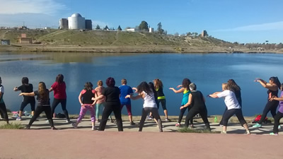 La profesora Miriam García, quien está a cargo del taller de zumba en la sede del barrio Unión de Trelew, dispuso una clase al aire libre aprovechando el clima y el paisaje que ofrece el parque recreativo Laguna Chiquichano. Enseguida se sumaron varias mujeres que forman parte del taller y otras que pasaban por el lugar.