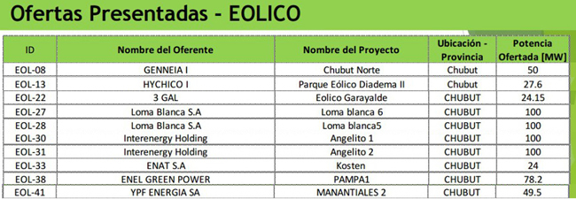 Diez son las ofertas para desarrollo eólico en Chubut: Genneia I presentó el proyecto «Chubut Norte» por 50 MW; Hychico I presentó el proyecto «Parque Eólico Diadema II» por 27.6 MW; 3 GAL presentó el proyecto Eólico Garayalde por 24.15 MW; Loma Blanca SA presentó el Loma Blanca 6 por 100 MW, y la misma empresa presentó el proyecto Loma Blanca 5 por otros 100 MW.