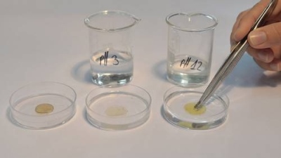 Pero el cambio en la acidez no es un fenómeno observable a simple vista sino que, para detectarse, requiere de alguna sustancia indicadora de ese cambio. “Descubrimos que, ante una disminución de la acidez, el film con extracto de albahaca cambia inmediatamente su tonalidad. Esta propiedad puede ser aprovechada para revelar que un alimento pudo haberse deteriorado”, señala Famá.