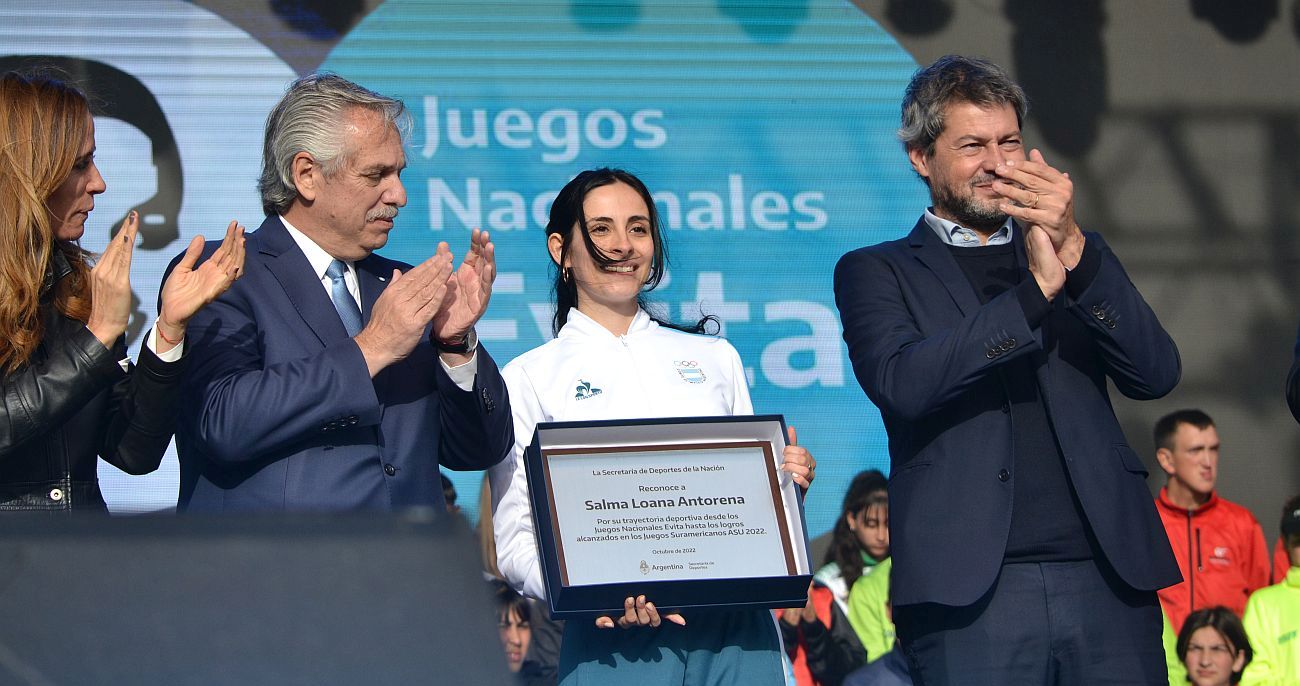 En dicho acto, el presidente Fernández hizo reconocimientos a deportistas destacados en los recientes juegos Suramericanos desarrollados en Asunción, Paraguay, entre las que se encontraba la chubutense Salma Antorena, en lo que fue la primera gran alegría para nuestra provincia en este evento.