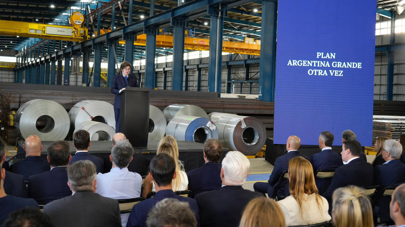 Milei señaló que “no es casualidad que hoy estemos en Sidersa, una de las primeras empresas en adherirse al RIGI”, que avanza en la construcción de una planta de última tecnología para la generación de productos largos de acero, fundamentales para el desarrollo de la infraestructura del país, con una inversión de casi u$s 300 millones.